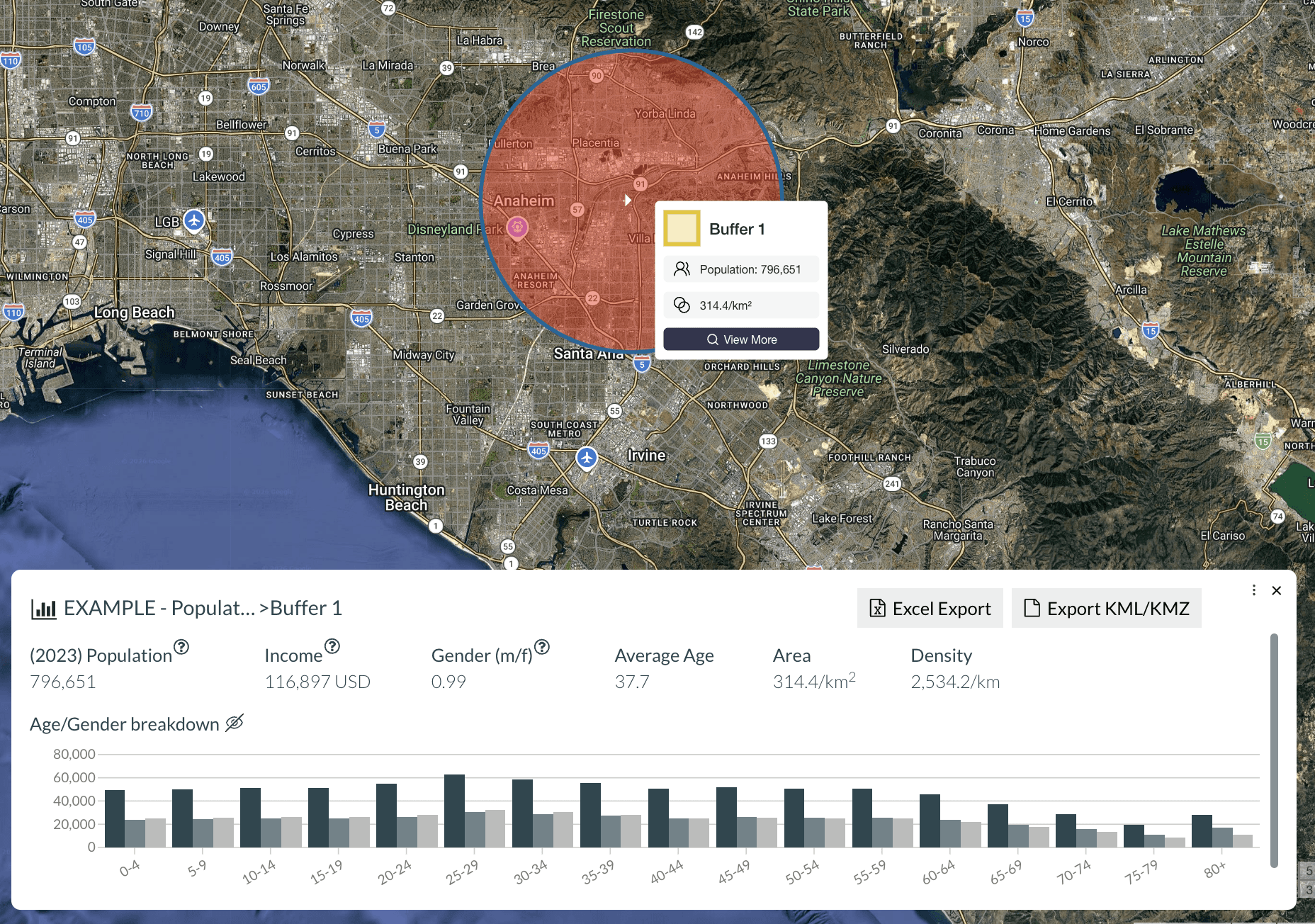 Draw a radius around any location and instantly calculate how many people live within that area. Whether you're evaluating a site, defining a territory, or analyzing a market, you can get answers in seconds.